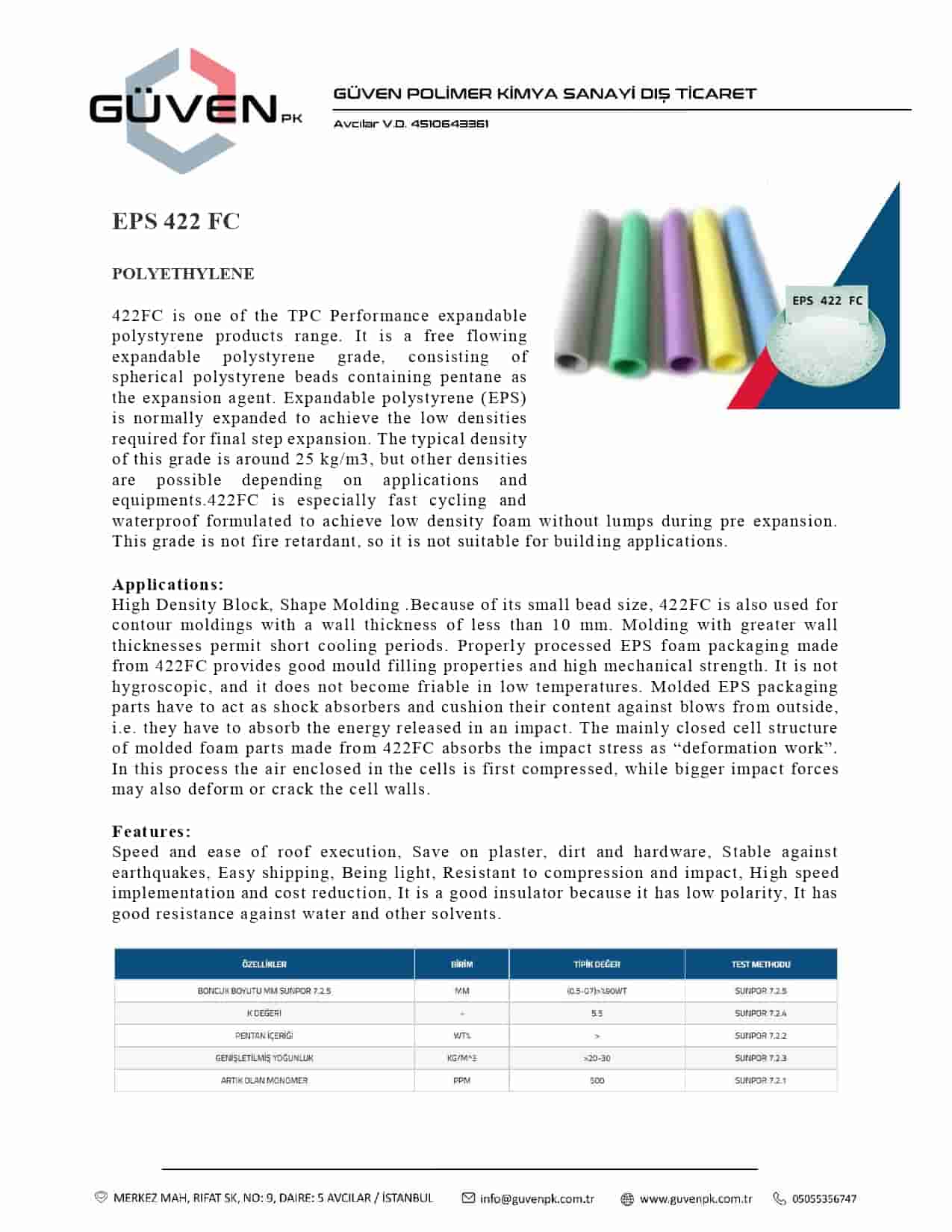 422FC is one of the TPC Performance expandable polystyrene products range. It is a free flowing expandable polystyrene grade, consisting of spherical polystyrene beads containing pentane as the expansion agent. Expandable polystyrene (EPS) is normally expanded to achieve the low densities required for final step expansion. The typical density of this grade is around 25 kg/m3, but other densities are possible depending on applications and equipments.422FC is especially fast cycling and waterproof formulated to achieve low density foam without lumps during pre expansion. This grade is not fire retardant, so it is not suitable for building applications.