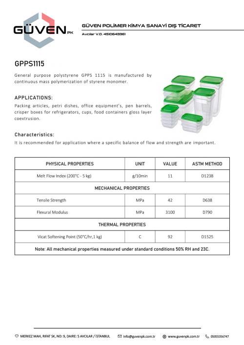 General purpose polystyrene GPPS 1115 is manufactured by continuous mass polymerization of styrene monomer.
