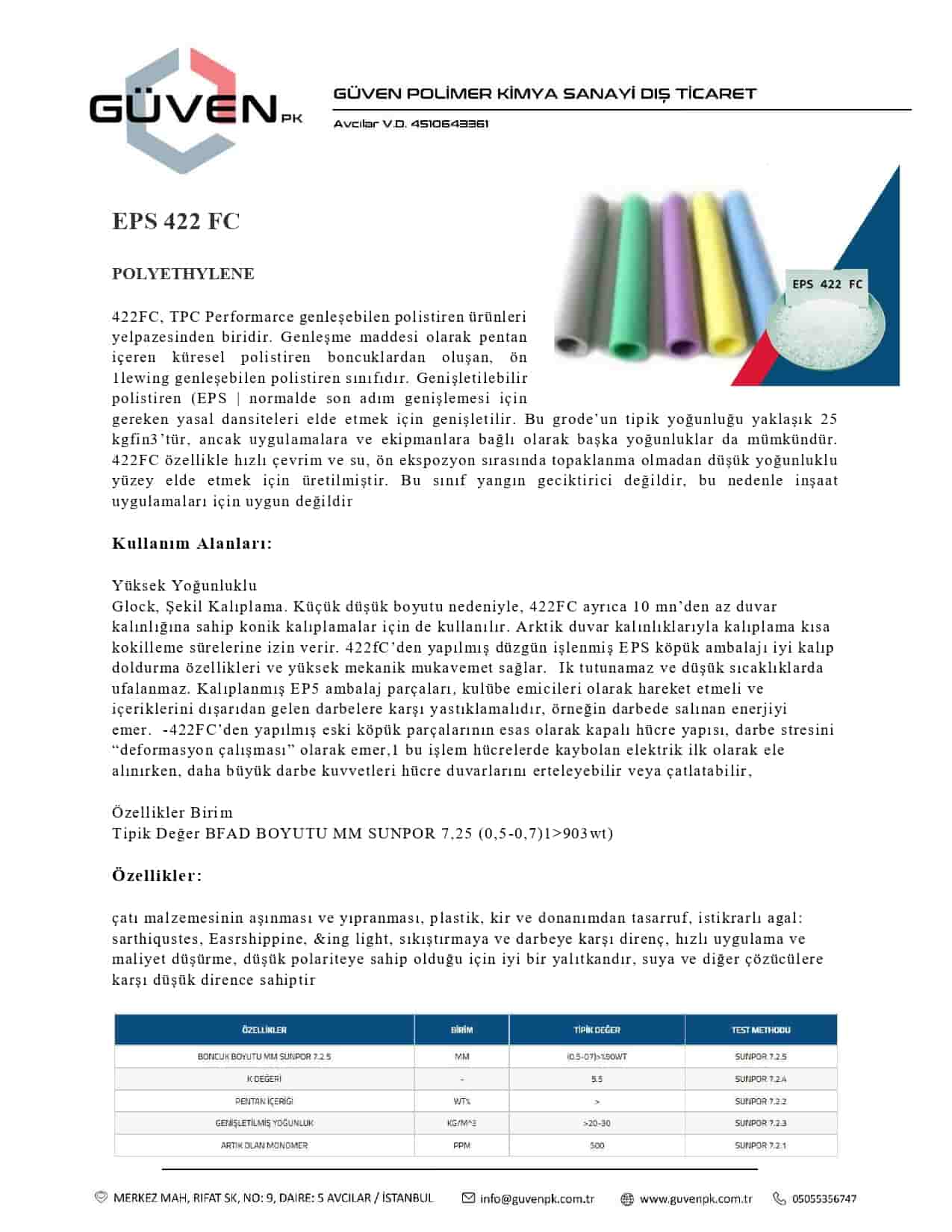 422FC, TPC Performarce genleşebilen polistiren ürünleri yelpazesinden biridir. Genleşme maddesi olarak pentan içeren küresel polistiren boncuklardan oluşan, ön 1lewing genleşebilen polistiren sınıfıdır. Genişletilebilir polistiren (EPS | normalde son adım genişlemesi için gereken yasal dansiteleri elde etmek için genişletilir. Bu grode’un tipik yoğunluğu yaklaşık 25 kgfin3’tür, ancak uygulamalara ve ekipmanlara bağlı olarak başka yoğunluklar da mümkündür. 422FC özellikle hızlı çevrim ve su, ön ekspozyon sırasında topaklanma olmadan düşük yoğunluklu yüzey elde etmek için üretilmiştir. Bu sınıf yangın geciktirici değildir, bu nedenle inşaat uygulamaları için uygun değildir