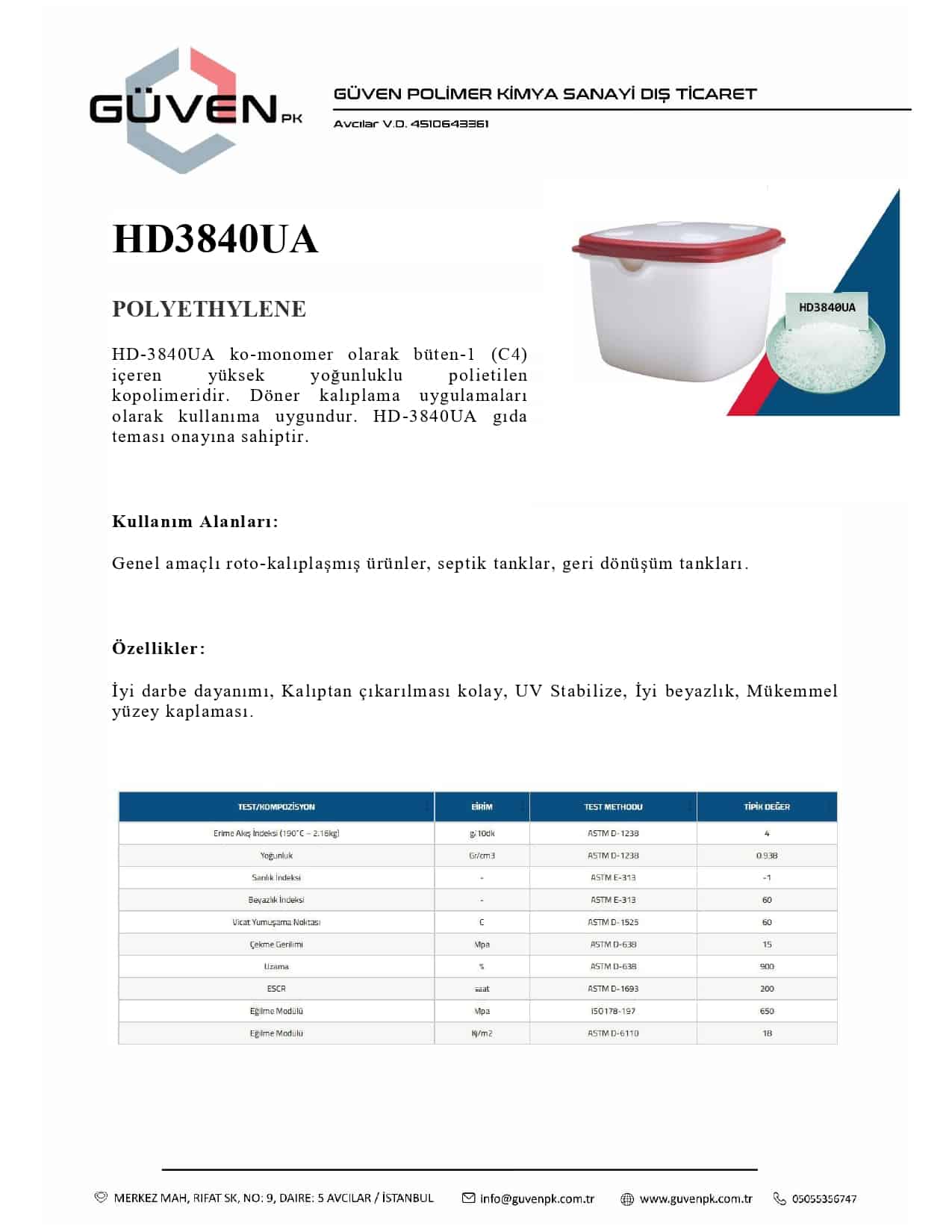 HD-3840UA ko-monomer olarak büten-1 (C4) içeren yüksek yoğunluklu polietilen kopolimeridir. Döner kalıplama uygulamaları olarak kullanıma uygundur. HD-3840UA gıda teması onayına sahiptir.
