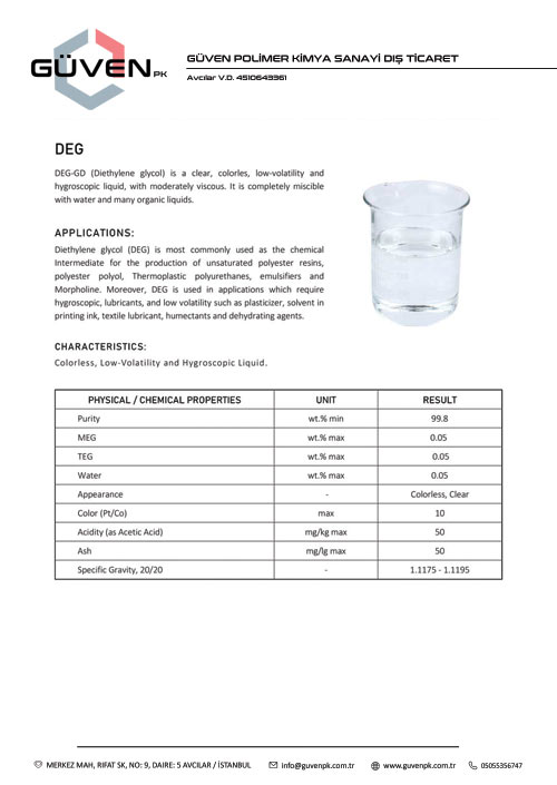 Diethylene Glycol (DEG) is an organic compound with the formula (HOCH2CH2)2O. It is miscible in water, alcohol, ether, acetone, and ethylene glycol. DEG is a widely used solvent. It can be a contaminant in consumer products.